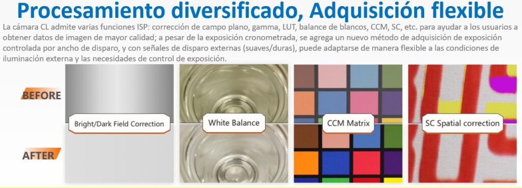 La cámara ha incorporado una variedad de algoritmos y funciones complejos, como compresión sin pérdidas, reducción de ruido 2D, corrección de sombreado de lente, CCM, etc., que pueden mejorar la calidad de imagen de la cámara en todas las direcciones, al tiempo que garantiza que la cámara tenga una mayor velocidad de fotogramas y más excelente calidad.
